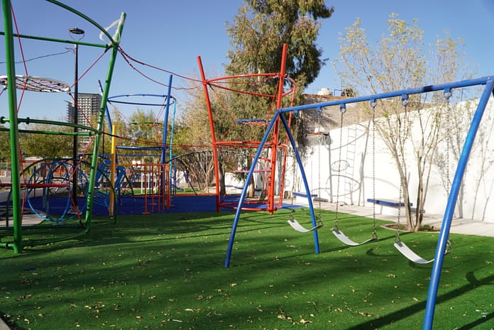 Chihuahua, Chih.- El Gobierno Municipal, a través de la Dirección de Obras Públicas, trabaja en la rehabilitación del parque Colinas del Sol, ubicado en avenida Las Águilas y Calle Washington, para beneficio de mil 500 ciudadanos que habitan en la zona.Con una inversión de 2 millones 202 mil 311 de pesos, se han realizado trabajos de rehabilitación de canchas deportivas, sistema de riego cambio de malla ciclónica perimetral, pintura en kiosco, sistema de riego, alumbrado tipo LED, colocación de letrero luminoso, bancas, juego y plantación de árboles.Actualmente, se cuenta con un avance del 80 por ciento y aun se trabaja en la colocación de piedra en áreas de jardinería y pasto sintético de color en zona de juegos.El Gobierno Municipal invita a las familias de Chihuahua a seguir de cerca los avances de este importante proyecto, el cual está destinado a mejorar la calidad de vida de los habitantes de Colinas del Sol y de colonias aledañas.