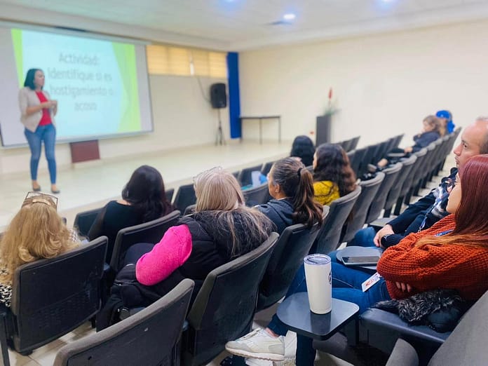 Las charlas estuvieron a cargo de la capacitadora de la Comisión Estatal de los Derechos Humanos (CEDH), Heli Trevizo Borja, quien en primera instancia brindó información sobre el tema de hostigamiento y acoso en el entorno laboral.