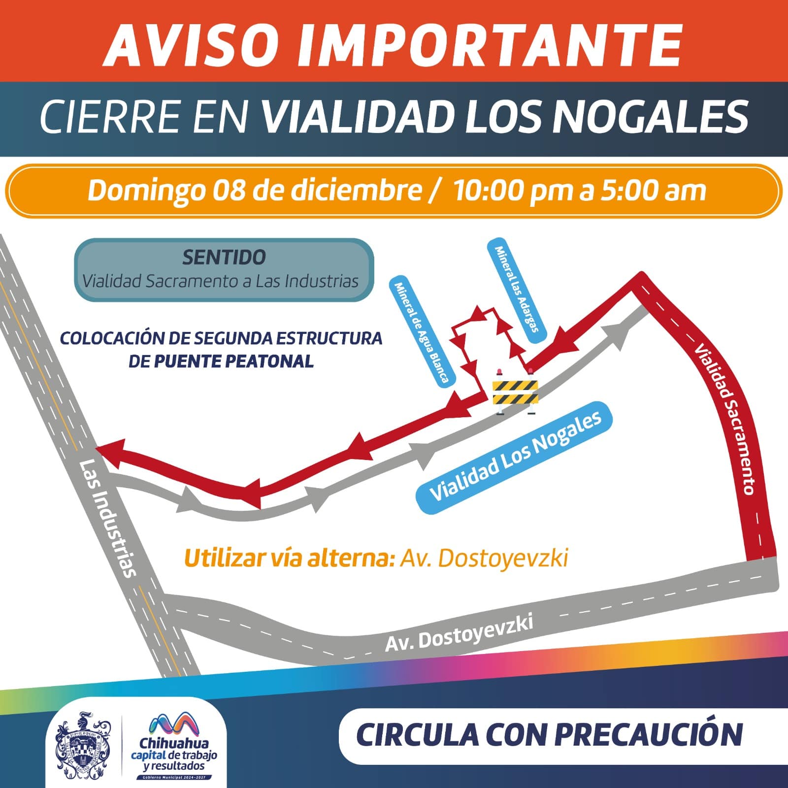 Chihuahua, Chih.- El Gobierno Municipal informa que a partir de las 10:00 de la noche del domingo 8 de diciembre hasta las 5:00 de la mañana del lunes, permanecerá cerrada la vialidad Los Nogales desde la Vialidad Sacramento a la avenida de Las Industrias, por el montaje de la estructura del puente peatonal.