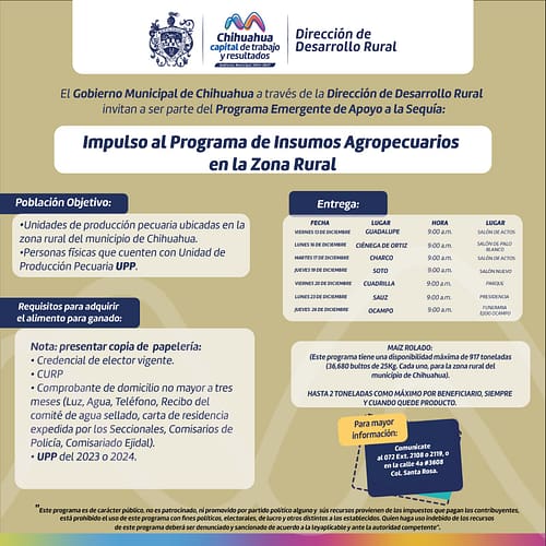 Chihuahua, Chih.- Para contener el impacto de la sequía en los seccionales rurales de la capital, el Gobierno Municipal que encabeza el alcalde Marco Bonilla, a través de la Dirección de Desarrollo Rural invitan a los productores agrícolas a participar en el Programa Emergente de Apoyo a la Sequía: Impulso al Programa de Insumos Agropecuarios en la Zona Rural.