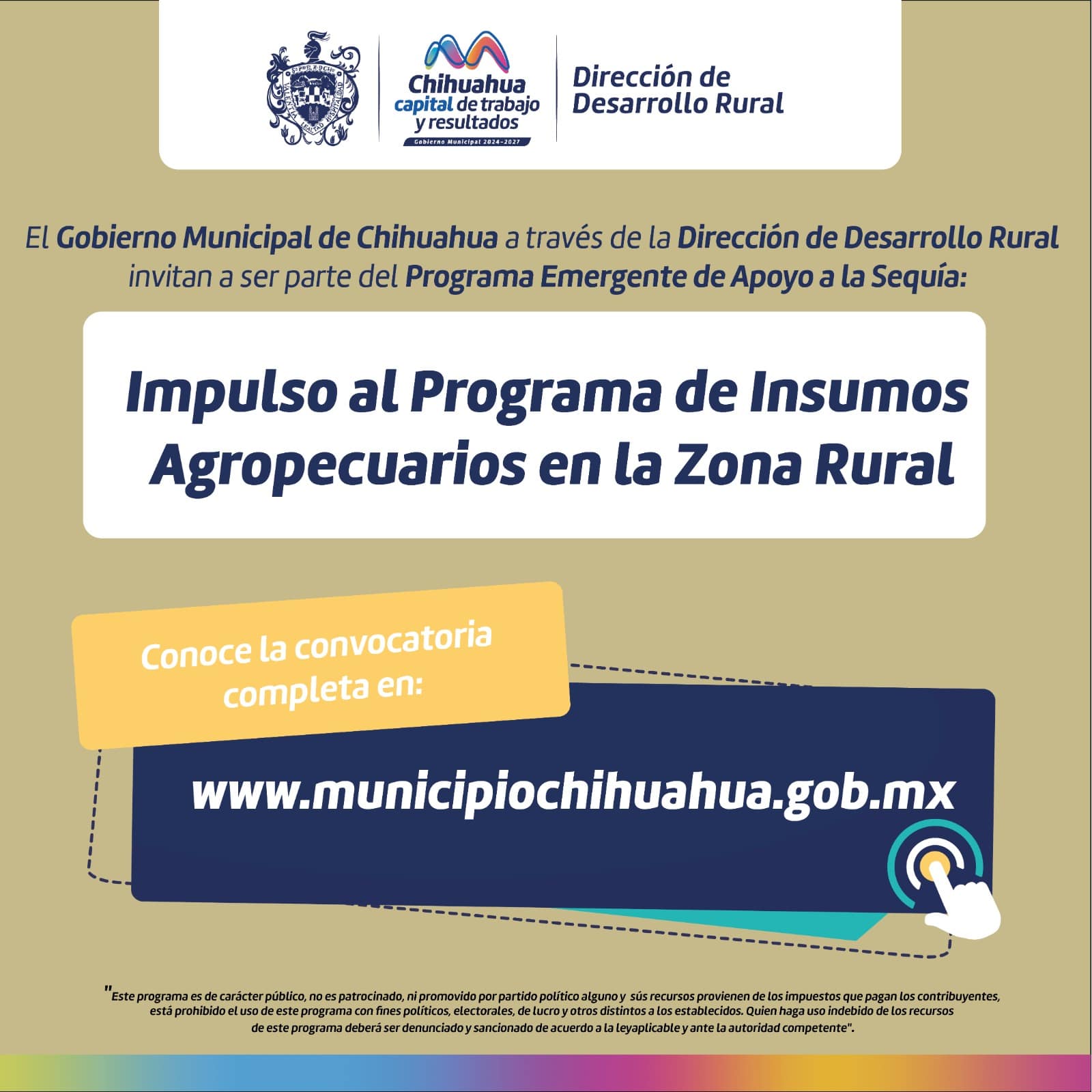 Para más detalles consulta la convocatoria en la página: www.municipiochihuahua.gob.mx/CCS/Convocatorias/Programa_emergente_de_Apoyo_a_la_Sequia o puedes comunícate al 072 extensión 2108 o 2119, o acude a la calle Cuarta número 3608, colonia Santa rosa.
