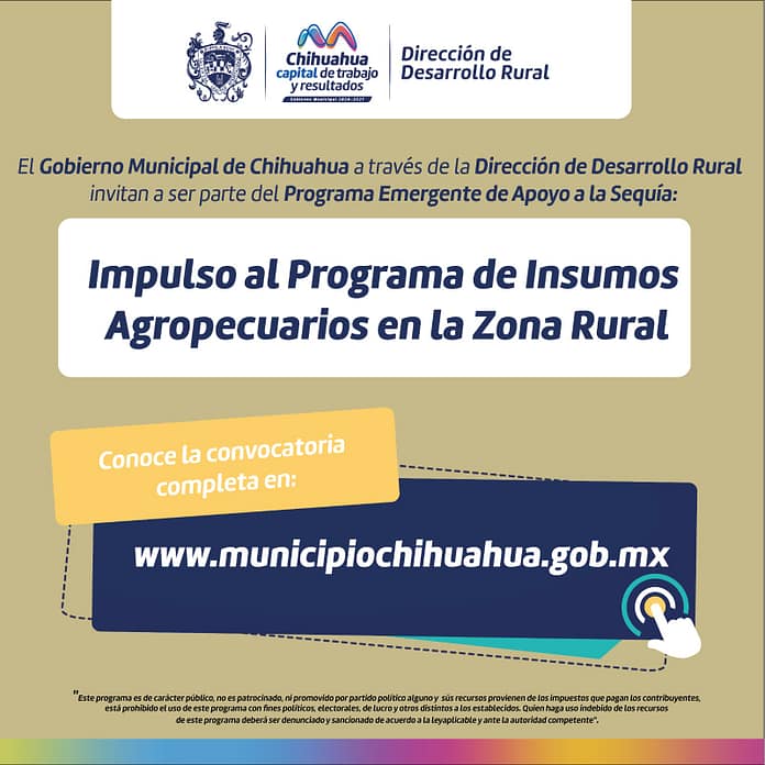 Chihuahua, Chih.- Para contener el impacto de la sequía en los seccionales rurales de la capital, el Gobierno Municipal que encabeza el alcalde Marco Bonilla, a través de la Dirección de Desarrollo Rural invitan a los productores agrícolas a participar en el Programa Emergente de Apoyo a la Sequía: Impulso al Programa de Insumos Agropecuarios en la Zona Rural.