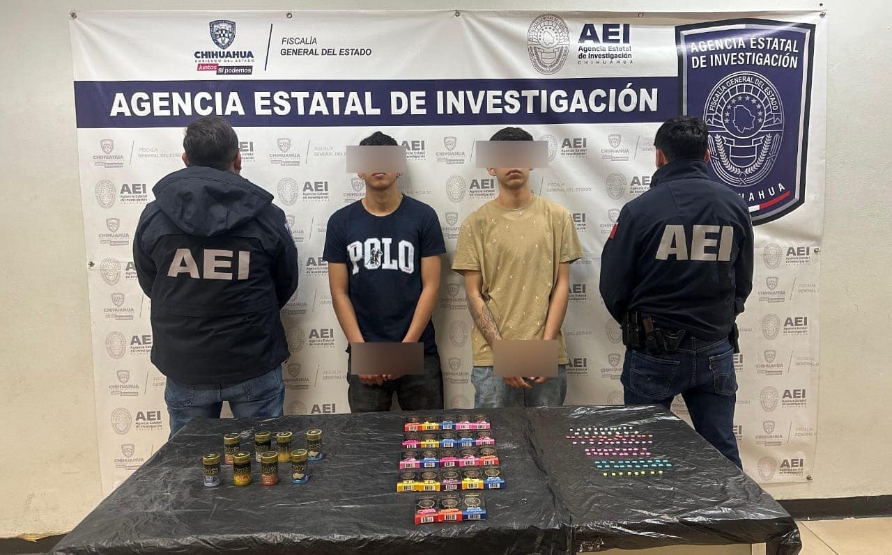 Elementos de la Agencia Estatal de Investigación, adscritos a la Fiscalía de Distrito Zona Norte, detuvieron en flagrancia a dos personas identificadas como Joaquín David P. G., y Erick Adrián E. A., por delitos contra la salud en Ciudad Juárez.