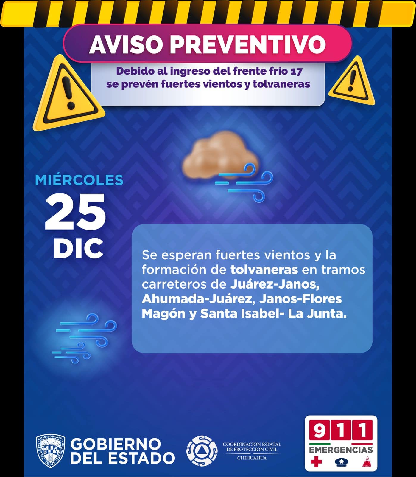 Para 25 de diciembre la CEPC advierte a la población ante el ingreso por la noche del frente frío número 17 a la entidad, que generará vientos con rachas de hasta 75 km/h en Janos, Casas Grandes, Nuevo Casas Grandes, Galeana, Ignacio Zaragoza, Gómez Farías, Namiquipa y Bachíniva.