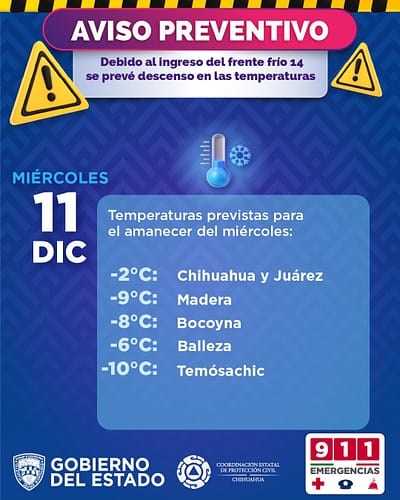 Las temperaturas mínimas previstas para la madrugada de este miércoles son: Ascensión -2°C, Ahumada -3°C, Allende 0°C, Aldama -2°C, Bocoyna -8°C, Chihuahua -2°C, Coyame 1°C, Coronado -1°C, Cuauhtémoc -6°C, Delicias -1°C, Guerrero -5°C, Guadalupe y Calvo -3°C, Guachochi -7°C y Janos -4°C.