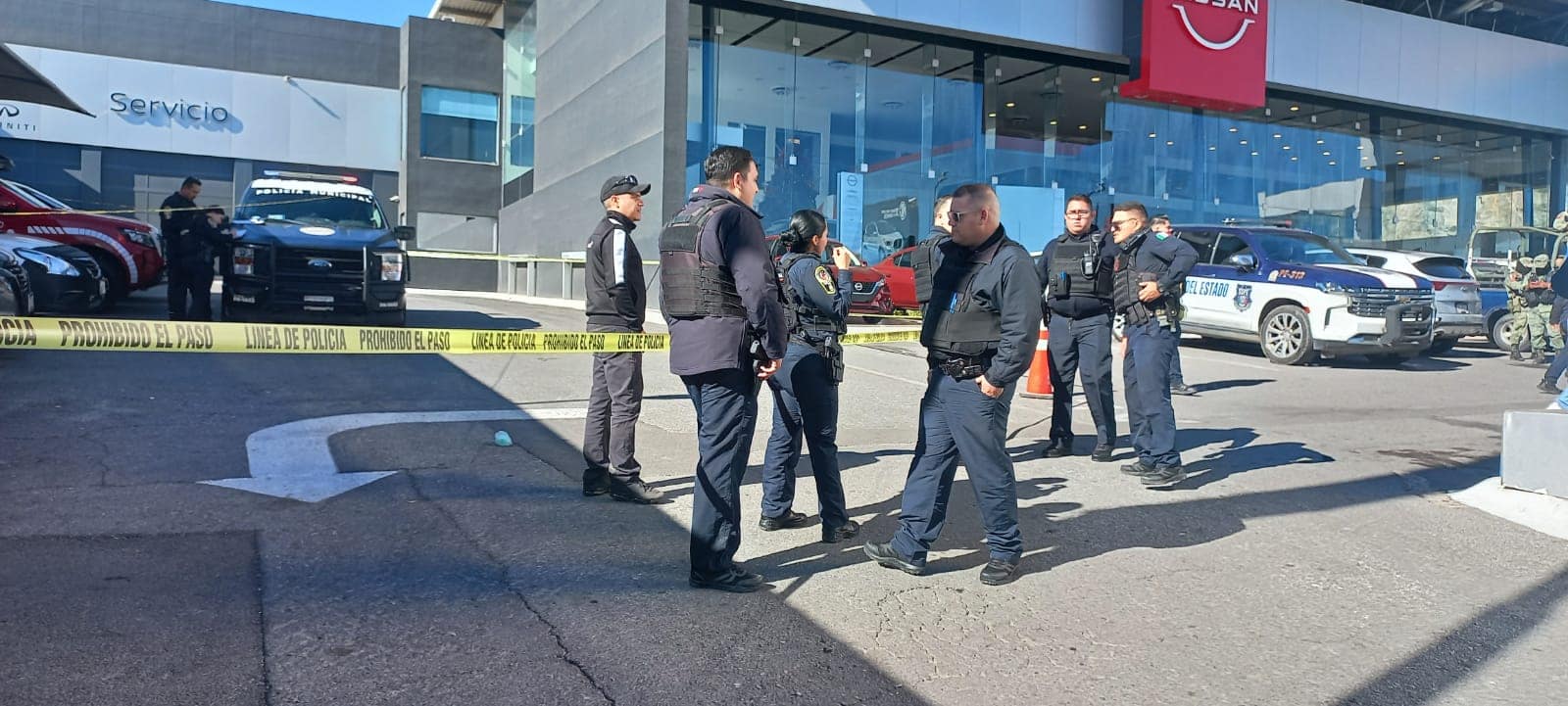 Autoridades llegaron al exterior de la agencia de autos Autotokio del periférico de la Juventud, luego de que les reportaran a una persona sin signos vitales.