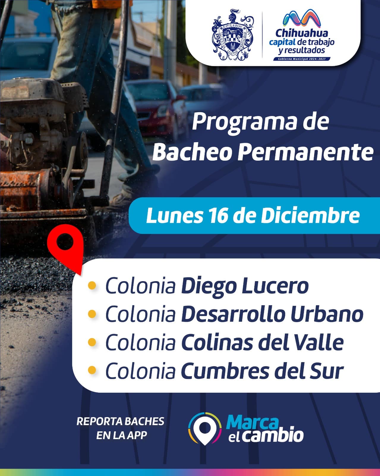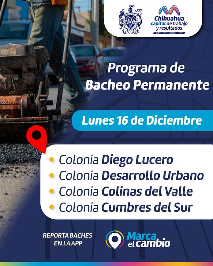 Chihuahua, Chih.- El Gobierno Municipal, a través de la Dirección de Obras Públicas, trabajará con bacheo este 16 de diciembre en calles de las colonias Diego Lucero, Colinas del Valle, Cumbres del Sur y Desarrollo Urbano.