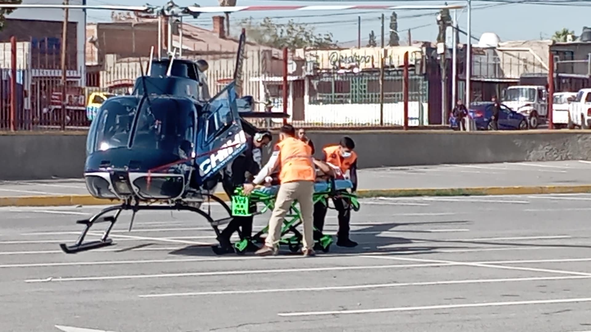 Una mujer de los tres lesionados de consideración, fue trasladada en el helicóptero de la Dirección de Seguridad Pública Municipal y aterrizó en el estacionamiento del centro de convenciones para llevarla al hospital Central en una ambulancia de urge apoyados por elementos de la Policía Vial y Policía Municipal.