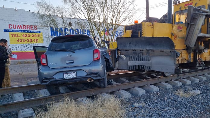 Un vehículo Nissan March fue arrastrado cerca de 30 metros, cuando el conductor intentó ganarle el paso a una maquinaria de Ferromex llamada «reguladora», sobre la calle Sicomoro en sentido de oeste a este.