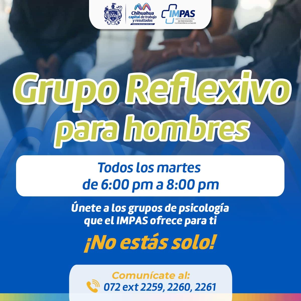 Los chihuahuenses pueden hacer uso de este servicio que se brinda de manera presencial en las instalaciones de la calle Francisco. Xavier Mina, número 408 todos los martes de 6:00 pm a 8:00 pm. Dicho grupo terapéutico del IMPAS tiene el objetivo de crear un espacio seguro dónde cualquier hombre mayor de edad pueda expresarse libremente en compañía de un terapeuta que guía las sesiones.