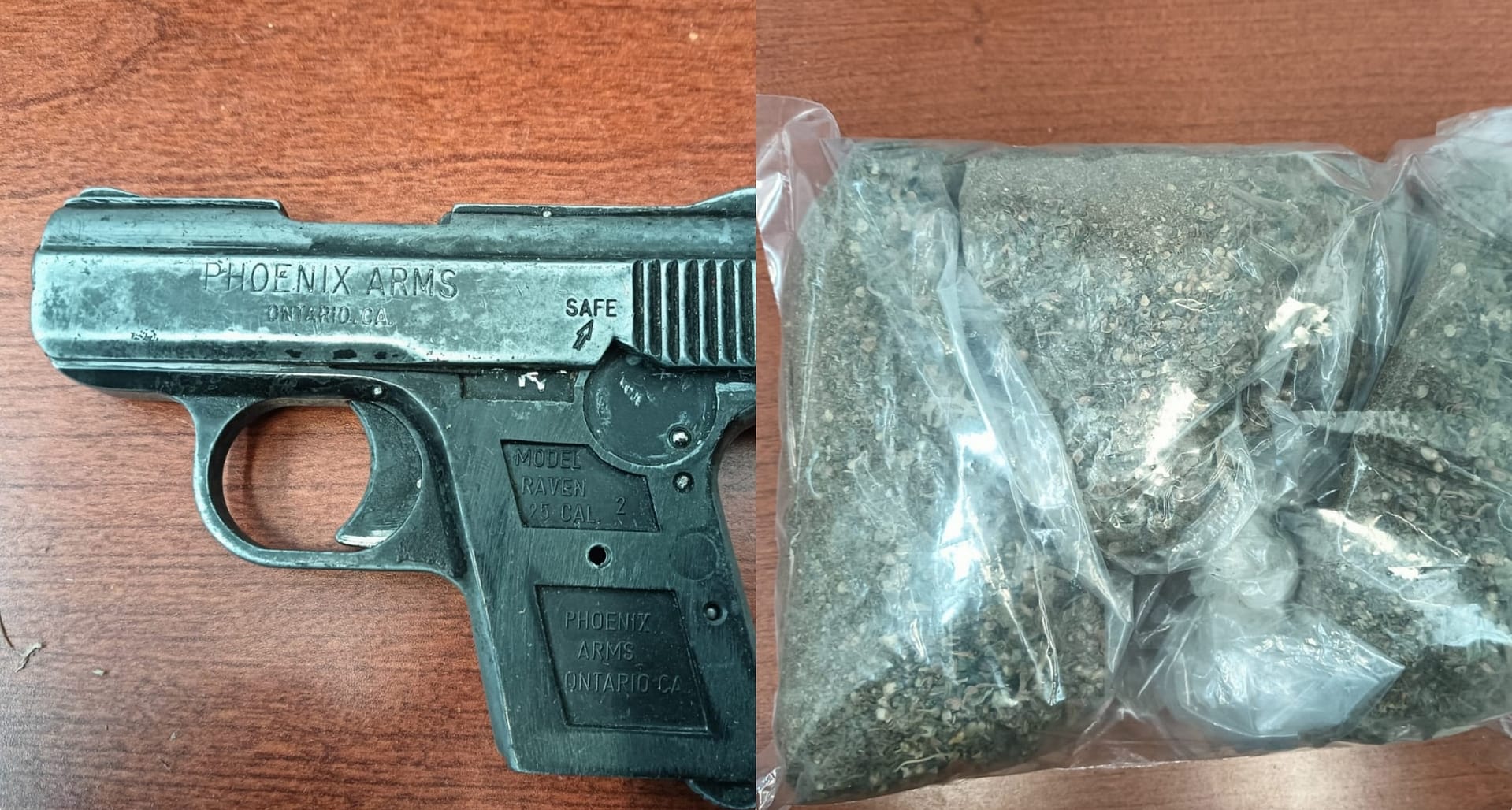 Tras realizar una inspección en el inmueble, los policías investigadores encontraron una pistola tipo escuadra, marca Phoenix Arms, calibre .25 milímetros, y tres bolsas de plástico que contenían 269.39 gramos de marihuana.