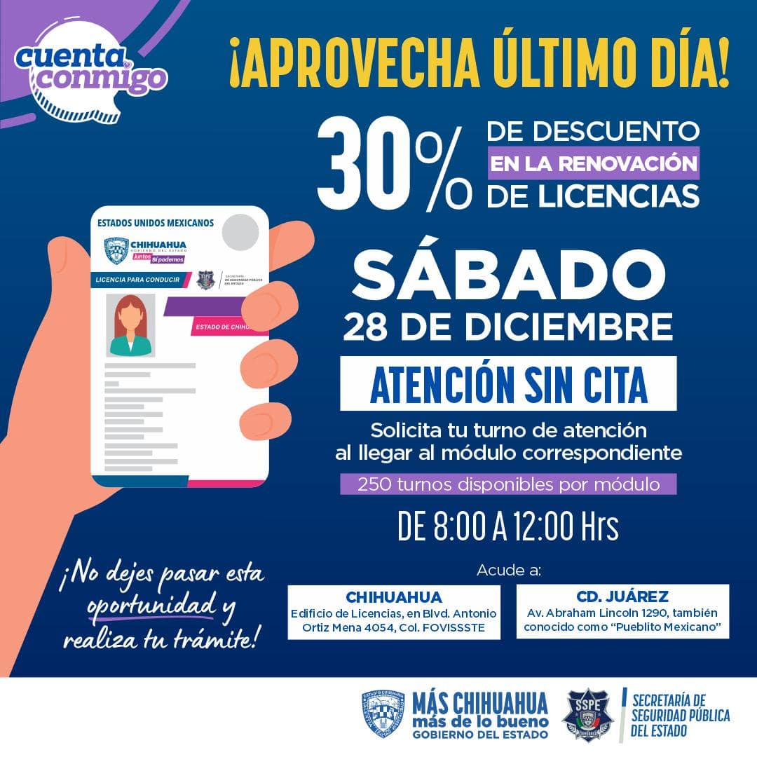 Con la intención de facilitar a los ciudadanos el acceso al descuento del 30 % en el costo de renovación de licencias, la Dirección de Movilidad y Cultura Vial de la Secretaría de Seguridad Pública del Estado (SSPE), dio a conocer que se abrió un horario especial para este sábado 28 de diciembre.
