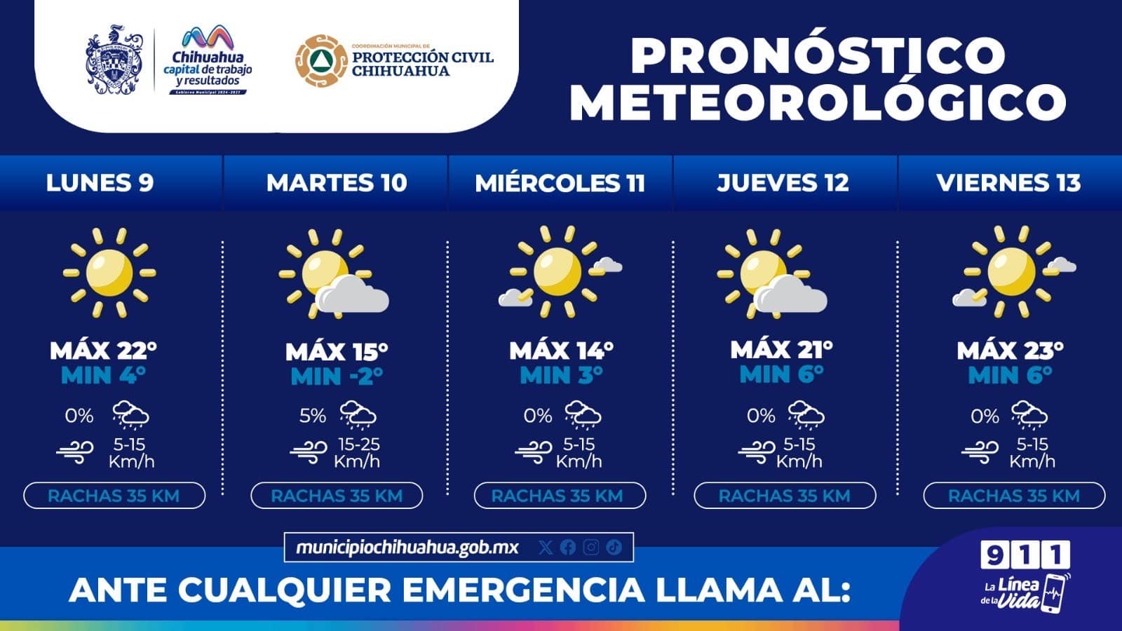 Chihuahua, Chih.- La Coordinación Municipal de Protección Civil emite recomendaciones ante el descenso en las temperaturas que se pronostica para esta semana del 9 al 13 de diciembre, donde prevén mínimas de hasta -2°C, lo anterior a fin de salvaguardar la integridad de las familias capitalinas.