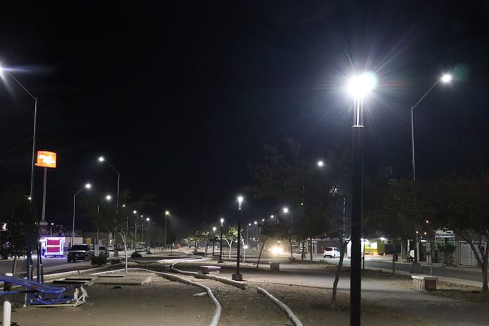Chihuahua, Chih.- El Gobierno Municipal, a través de la Dirección de Mantenimiento Urbano, modernizó el alumbrado público a luz LED en el camellón central y área verde ubicada en la calle Río Atuel.