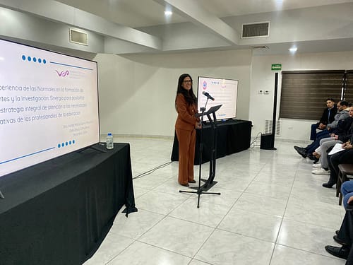La conferencia “La experiencia de las Normales en la formación docente y la investigación: Sinergia para posibilitar una estrategia de atención a las necesidades formativas de los profesionales de la educación”, estuvo a cargo de Holda María Espino Rosendo, maestra en Investigación en Psicología aplicada a la Educación por la Universidad de Veracruz.
