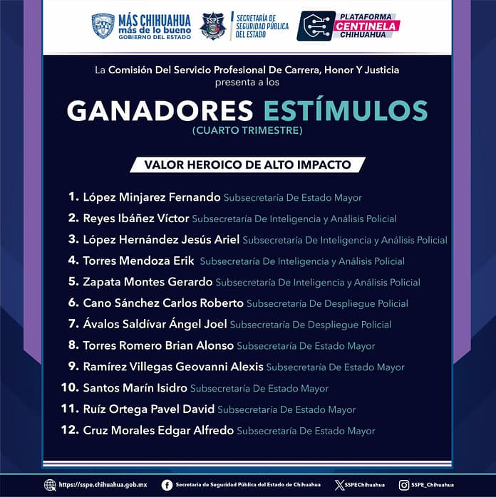 La Secretaría de Seguridad Pública del Estado (SSPE), a través de la Comisión del Servicio Profesional de Carrera, Honor y Justicia, reconoció a los 12 ganadores de los estímulos por valor heroico en el cuarto trimestre de 2024, así como a Enrique Tarango Muñiz, galardonado como Policía del Año 2024.