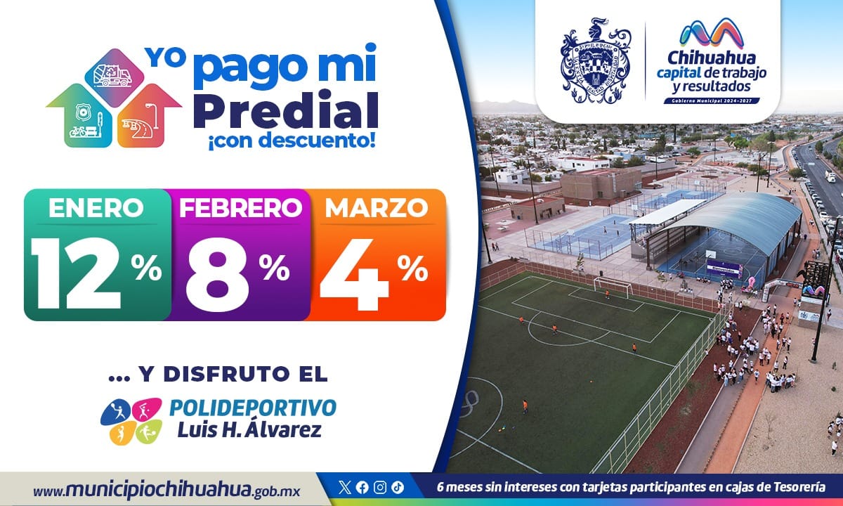 Chihuahua, Chih.- El Gobierno Municipal, a través de Tesorería, invita a aprovechar el 12 por ciento de descuento en el Impuesto Predial que estará vigente a partir del 2 de enero, para personas físicas y morales.