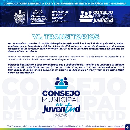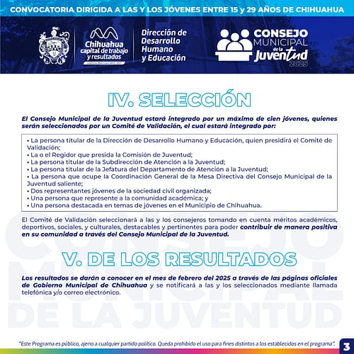 Chihuahua, Chih.- El Gobierno Municipal, a través de la Dirección de Desarrollo Humano y Educación, reitera la invitación para jóvenes de 15 a 29 años para formar parte del “Consejo Municipal de la Juventud” edición 2025, que busca mejorar el entorno a través de iniciativas y proyectos de orden social, educativo, altruista, seguridad y ecológicos.