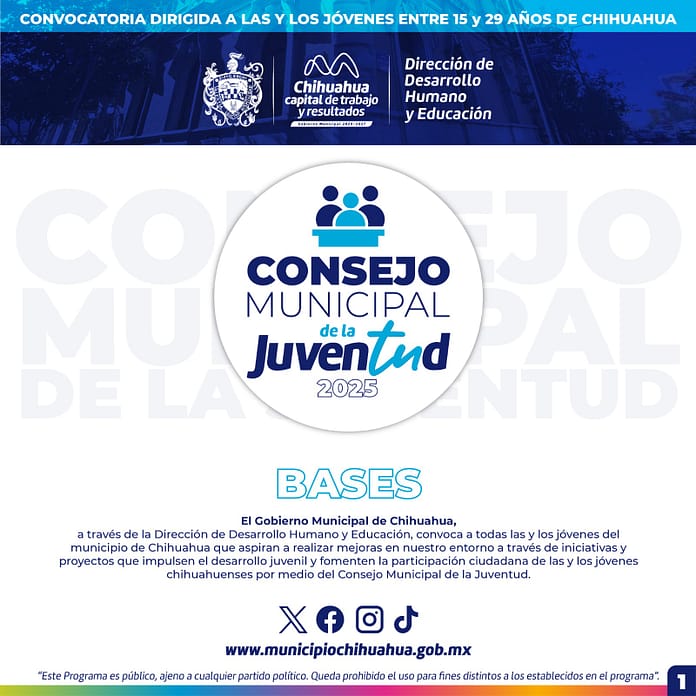 Chihuahua, Chih.- El Gobierno Municipal, a través de la Dirección de Desarrollo Humano y Educación, reitera la invitación para jóvenes de 15 a 29 años para formar parte del “Consejo Municipal de la Juventud” edición 2025, que busca mejorar el entorno a través de iniciativas y proyectos de orden social, educativo, altruista, seguridad y ecológicos.