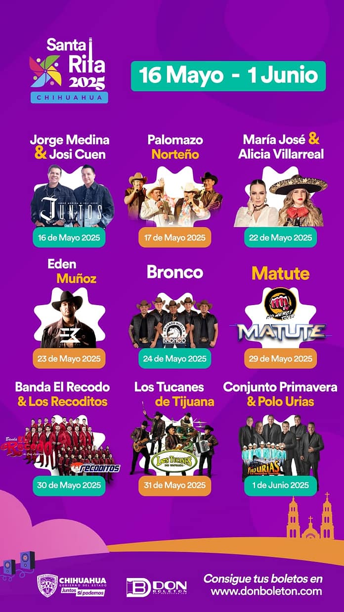 Chihuahua, Chih.- La Feria de Santa Rita 2025, uno de los eventos más emblemáticos del estado, está lista para recibir a miles de asistentes con una cartelera de lujo en el Palenque, que se desarrollará del 16 de mayo al 1 de junio. Grandes figuras del regional mexicano, pop y otros géneros se presentarán en el recinto, consolidándolo como el epicentro del entretenimiento nocturno.