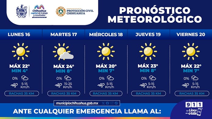 Chihuahua, Chih.- La Coordinación Municipal de Protección Civil informa que, para esta semana, del 16 al 20 de diciembre, se pronostica temperaturas frías, por lo que exhortan a cuidarse para prevenir enfermedades respiratorias.