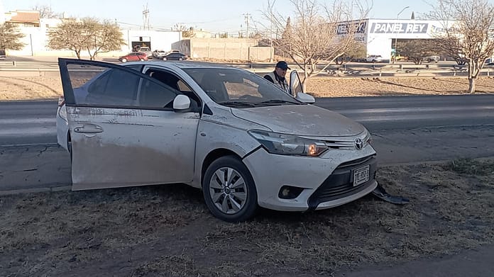 La conductora de un vehículo Toyota Yaris, circula sobre la Vialidad de Los Nogales en sentido de oeste a este y a la altura de la fábrica de chachitos, pierde el control en la curva se impacta contra la banqueta y un cerro donde estuvo a punto de volcar.